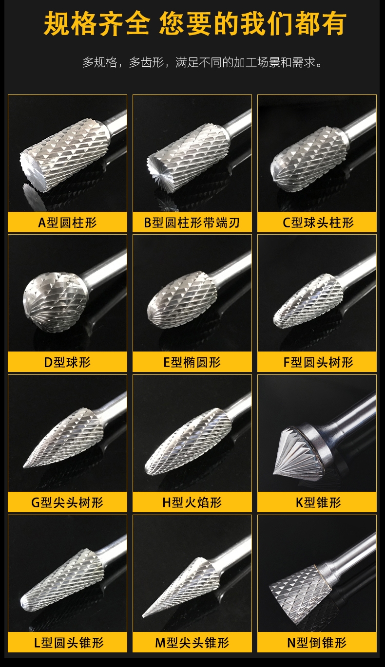 硬質合金旋轉銼,亦稱硬質合金高速什錦銑刀、硬質合金模具銑刀等,與高速電磨機或風動工具配套使用。硬質合金旋轉銼優點